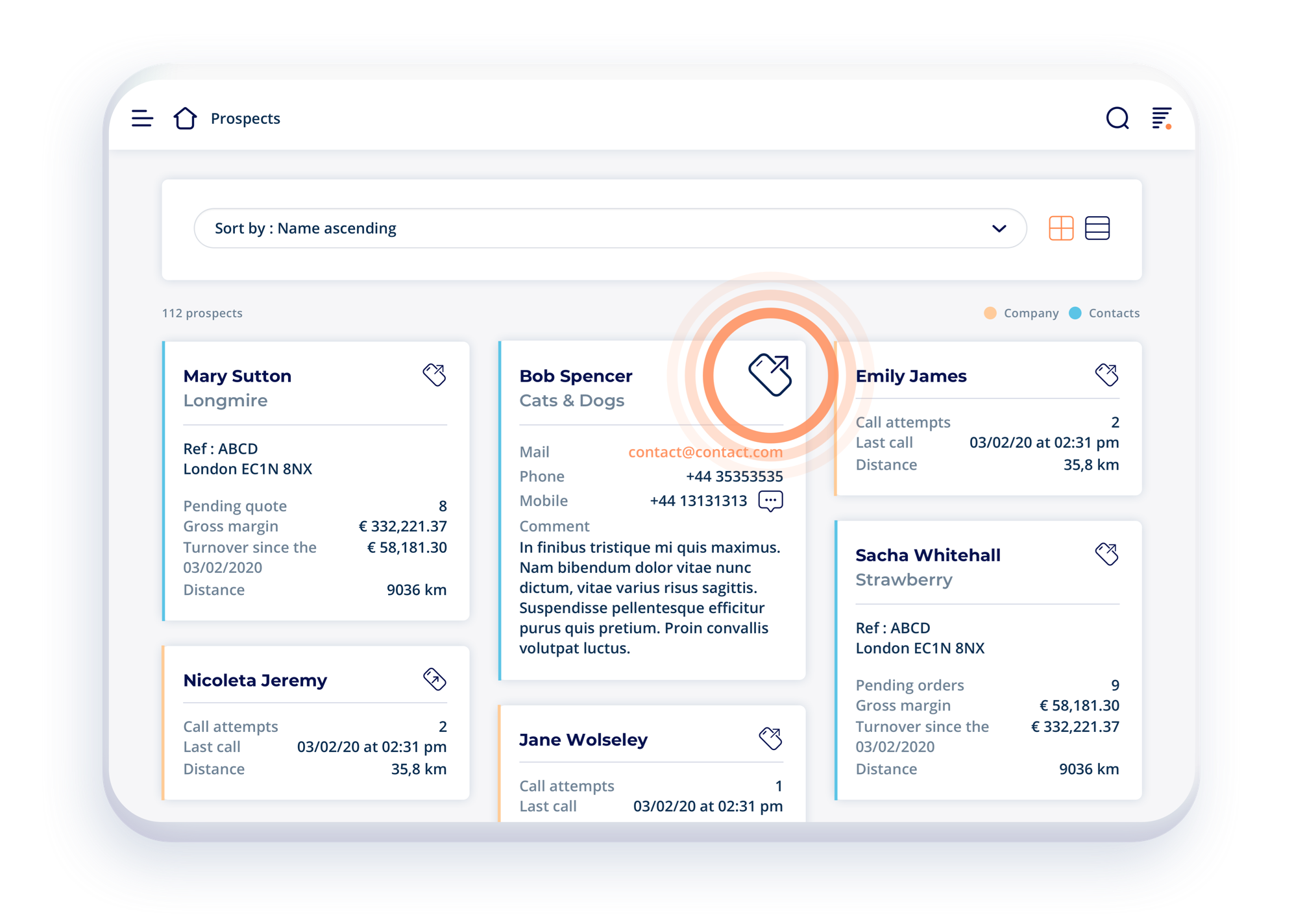 From now on your customer card is easily available. Consult, add or change, no matter your positioning, your customer or prospect cards. You can easily have displayed on one screen all the people that have made an order. Segment, categorise and organise to sell better, and to discover profiles with huge potential. In a simple user interface you can consult the last quotes, bills, orders in progress, the activity feed and even the turnover of your customer. Now you won’t miss a thing!