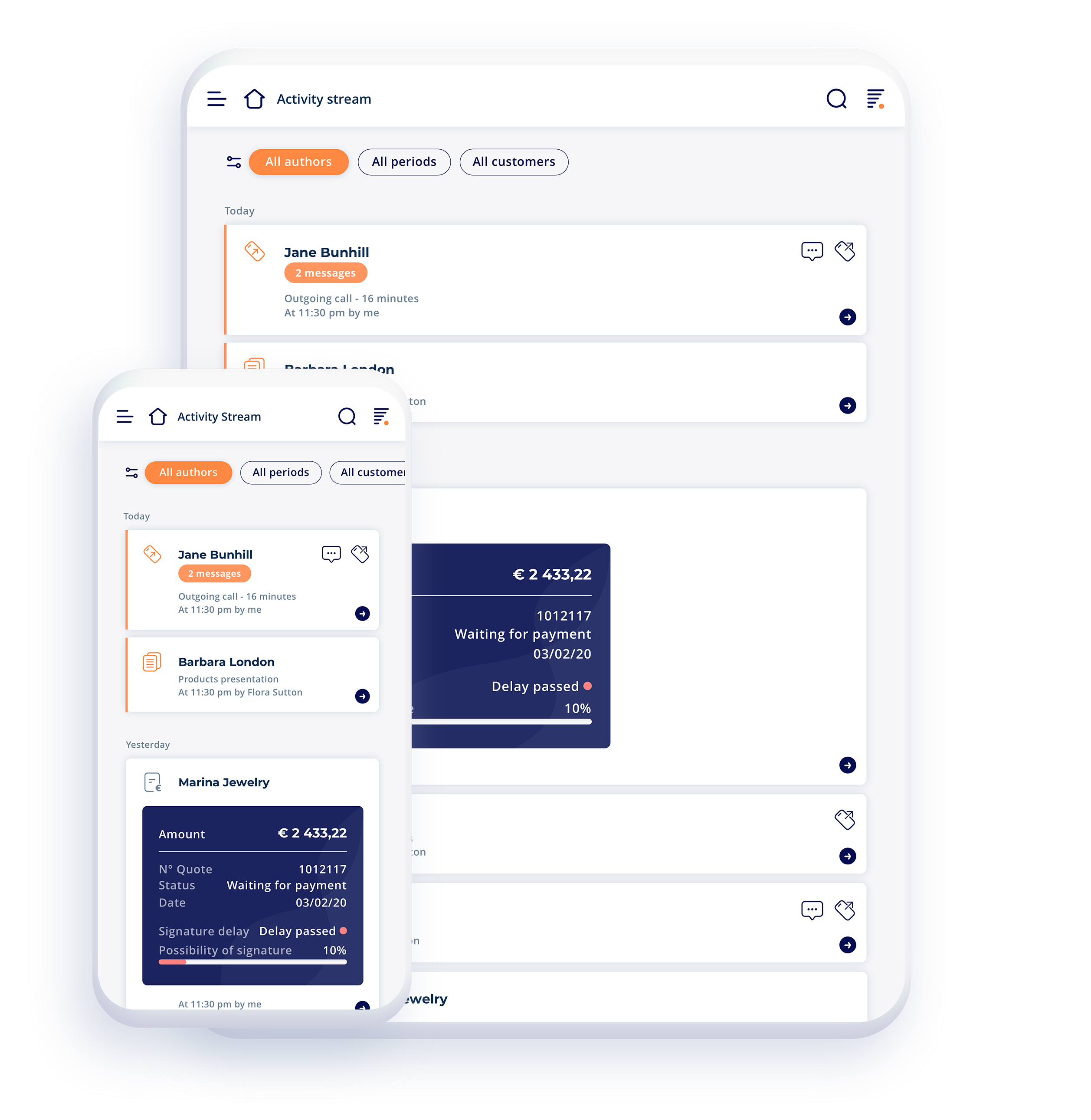 Customers to solicit, ongoing quotes, Commercial Pipeline, news… your commercial app saves all contact between the company and the customers. These exchanges are visible from the dashboard, also called widgets, accessible through the homepage. These widgets are entirely customisable to show only what really interests you.